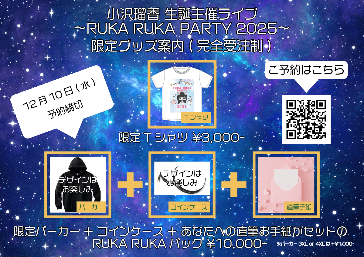 お名前 *電話番号 *メールアドレス *Tシャツサイズ *選択肢一つを選択してください枚数 *選択肢一つを選択してくださいお届け方法 *選択肢一つを選択してくださいお支払い方法 *1週間以内のお支払いをお願い致します選択肢一つを選択してください完全受注生産のためキャンセルはできません *ご質問やお問い合わせRUKA RUKA パック